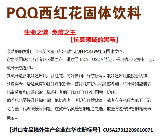 【產(chǎn)品名稱】:PQQ西紅花固體飲料 進口產(chǎn)品